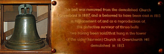 There were three bells in the old Norman church located at Overchurch Hill, two of these were sold in 1709 to help pay for repairs to the church. A reproduction of the remaining bell was cast in 1813 when the church at Greenbank was built. This bell is now kept in St Mary's Church.